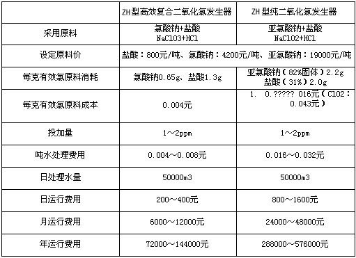 ZH系列復合二氧化氯發生器使用鹽酸和氯酸鈉為原料,鹽酸(30%)的價格800元/噸,氯酸鈉的價格為4200元/噸。根據該發生器的額定消耗量計,一般每生產1克有效氯消耗氯酸鈉0.65g、鹽酸1.3g,折合人民幣約0.004元。投加量通常為1~2ppm,則:噸水成本約為:0.004~0.008元/噸。ZH型純二氧化氯發生器使用鹽酸和亞氯酸鈉為原料,鹽酸(31%)的價格800元/噸,亞氯酸鈉的價格為19000元/噸。根據該發生器的額定消耗量計,一般生產1克ClO2消耗亞氯酸鈉(82%NaClO2)2.2g、鹽酸(31%HCl)2.0g。折合人民幣約0.043元,折合成有效率約為:0.043÷2.63=0.016元。有效氯投加量通常為1~2ppm,則:噸水成本約為:0.016~0.032元/噸。